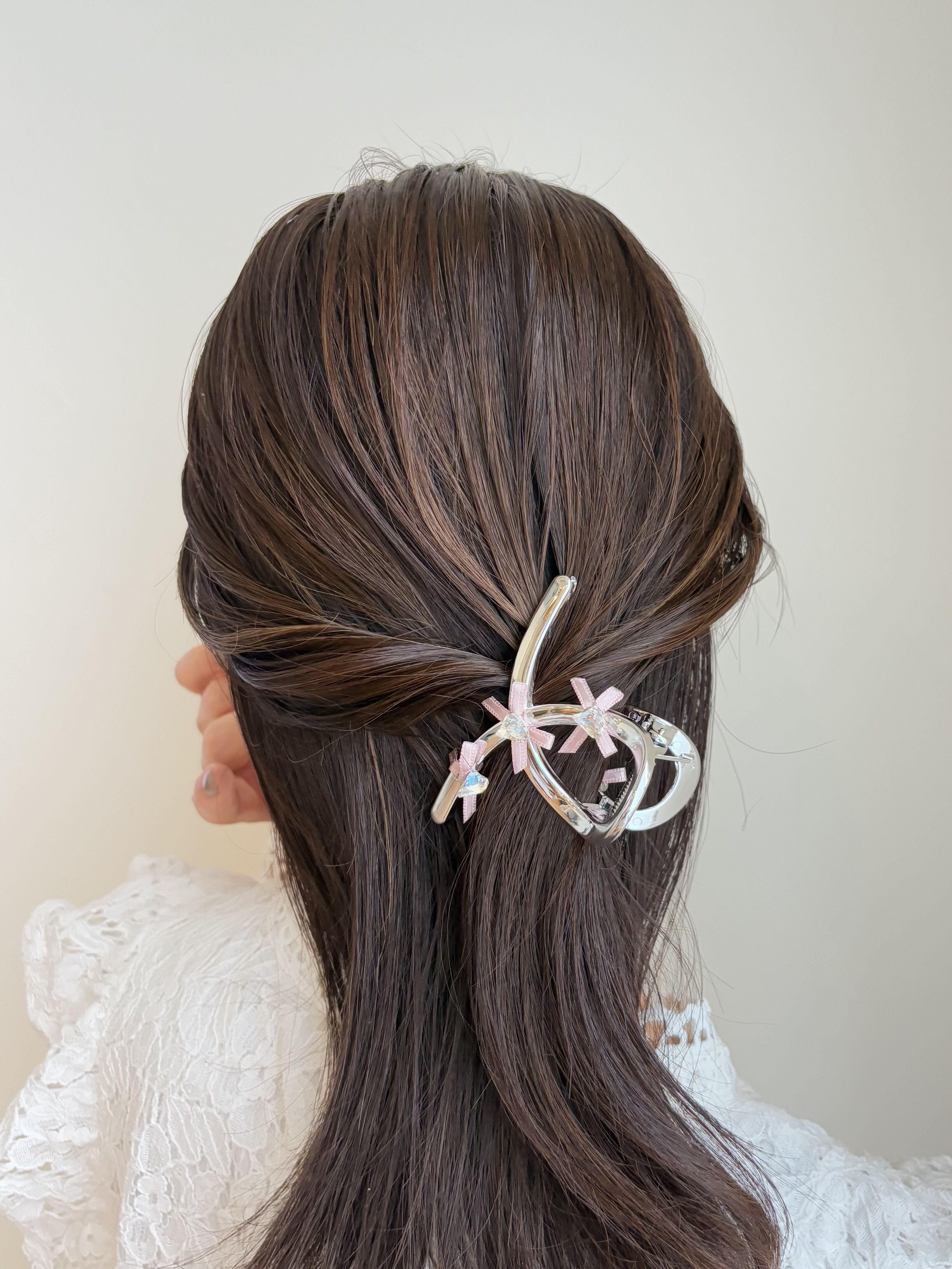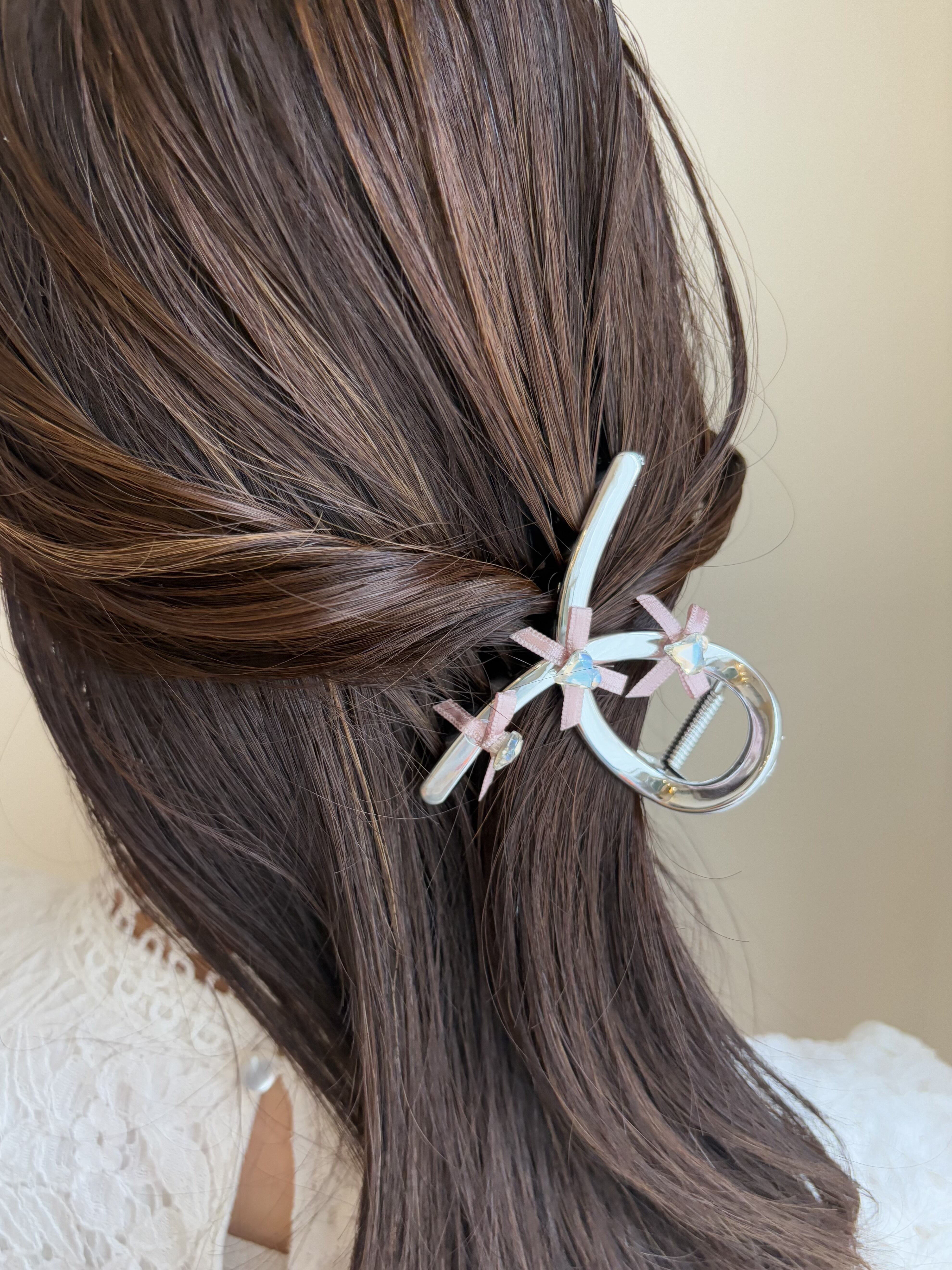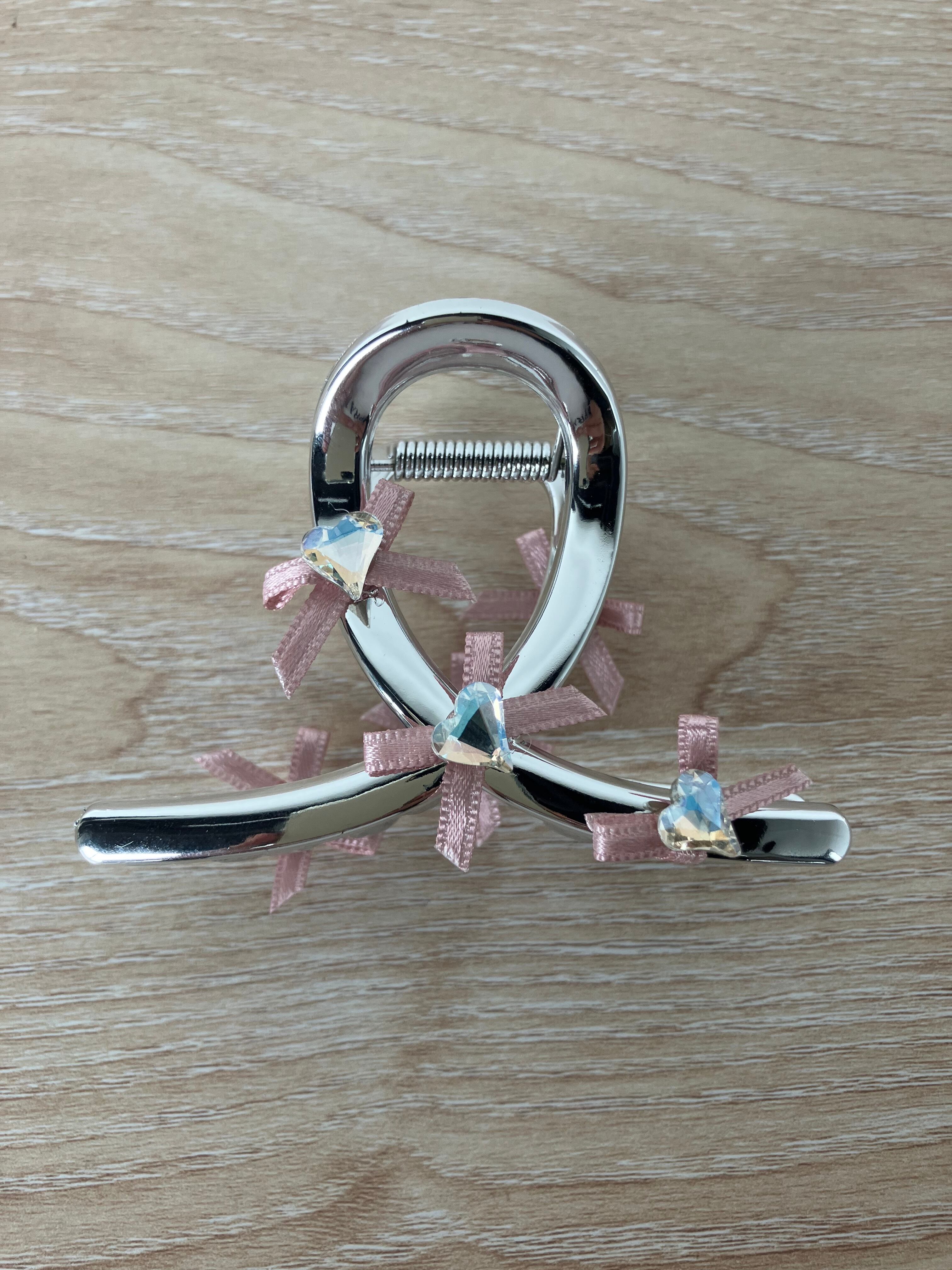このシルバーピンクリボン付きヘアクリップ小は、あなたのスタイリングを一層素敵に彩るアイテムです。